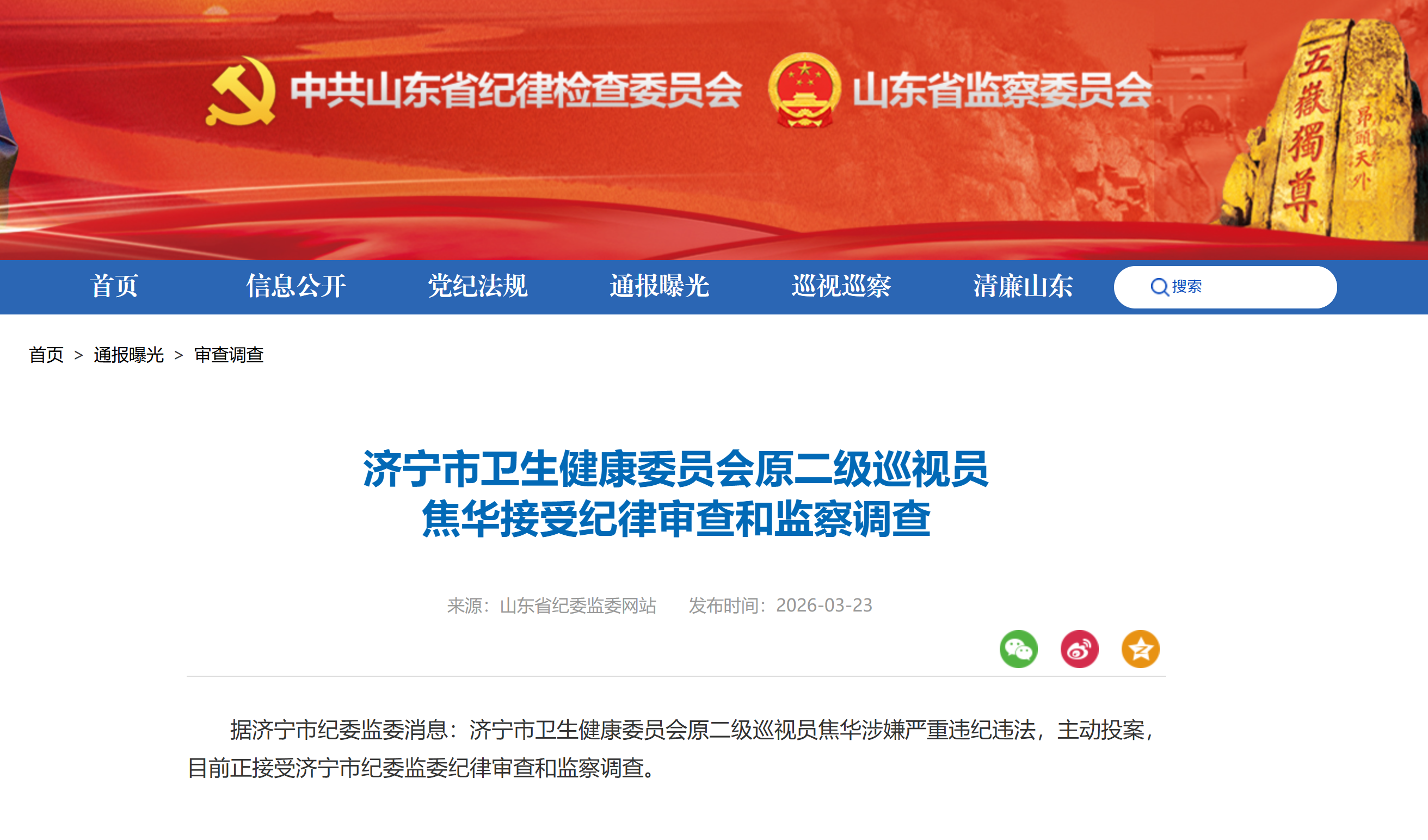 济宁市卫生健康委员会原二级巡视员焦华被查观政 | 2026-03-23 17:56:34 原创范佳来源:齐鲁晚报·齐鲁壹点客户端微信扫码扫码下载客户端山东省纪委监委网站3月23日消息,济宁市卫生健康委员会原二级巡视员焦华涉嫌严重违纪违法,主动投案,目前正接受济宁市纪委监委纪律审查和监察调查。责任编辑:范佳