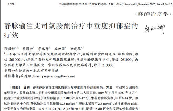 美国FDA于2019年批准艾斯氯胺酮鼻喷剂用于抗抑郁治疗,但由于其抗抑郁平均时间只有3周,疗效不如静脉注射,部分病人有严重精神解离症状等诸多问题都亟待解决。安建雄课题组从2019年开始,组织开展艾斯氯胺酮快速抗抑郁为主的多模式快速抗抑郁临床和实验研究,为了解决上述问题,先后在临床研究设计采取了在诱导自然睡眠后输注艾斯氯胺酮、治疗结束时采用特殊药物驱离噩梦、用居家病人自控睡眠法修复睡眠障碍、并减停精神类药物的使用和修复抑郁症的脑损伤。安建雄教授将其艾斯氯胺酮快速抗抑郁组合简称为“两快一滴定”。研究成果发表在近期我国麻醉学顶级期刊《中华麻醉学杂志》,第一作者为山东第二医科大学麻醉学院研究生孙丽娜,以及南京医科大学第三附属医院吴周全主任医师,通讯作者为我国麻醉创新诊疗学科带头人,多所著名大学的博士研究生导师,山东第二医科大学附属医院和南方医科大学中西医超快速抗抑郁中心主任的安建雄教授。