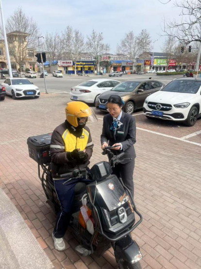 活动现场,网点金融宣教小队的工作人员正与一位外卖员面对面交流,结合手机操作场景,细致讲解移动支付安全、个人信息保护、电信诈骗防范等实用知识。针对“两司两员”群体工作节奏快、高频使用移动支付的特点,宣讲团队采用“以案说险”的通俗方式,重点拆解刷单返利、冒充客服退款、虚假理财等高发骗局,手把手指导大家识别风险、规范操作,提醒大家不轻信陌生来电、不随意透露验证码、不向陌生账户转账。