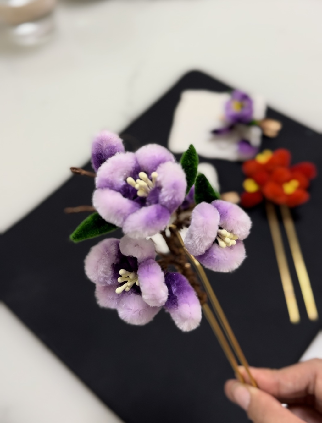 第一次做出来的绒花,露着铜丝,并不美观。但毛妮儿没有泄气。母女俩一起研究,查资料,找问题。线买错了,梳子也不对,小手都磨出了水泡。一次次失败,一次次调整。