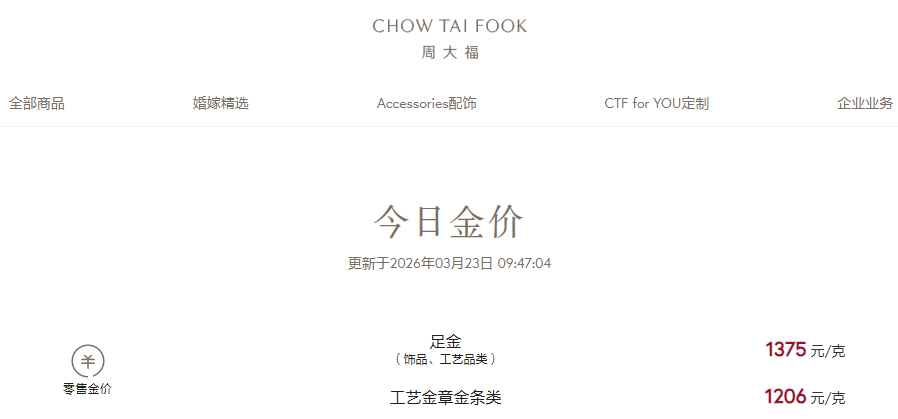 周大福、周生生、老庙黄金、六福珠宝等主流金饰品牌足金报价相比月初普遍下跌200多元,目前均已跌破1400元/克关口。终端市场消费者观望情绪浓厚,部分门店咨询量有所上升,但实际成交相对谨慎。