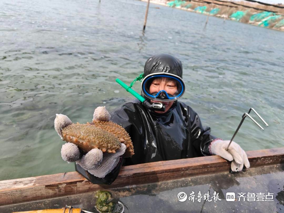当天早晨7点,在即墨区田横镇的海参养殖池边,蛙人于发瑞穿上厚重的潜水衣,纵身跃入一米多深的参池。他手持专用铁钩,在水下熟练地搜寻池底的海参,短短十几分钟就收获了30多斤个大肉厚的海参。“从早上七点一直干到十一点,4个多小时能捞500多斤海参。”于发瑞一边将捕捞网兜里的海参倒进船上的塑料筐,一边对记者说。他介绍,今年春季海参生长态势良好,其中个头最大的单只足有一斤多重。