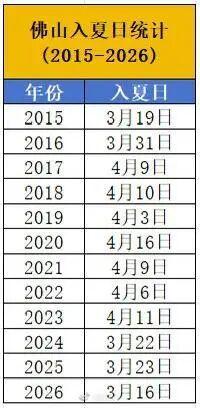 根据佛山市气象部门通报,根据中华人民共和国国家标准——《气候季节划分》(GB/T 42074-2022)规定,依据当年5天滑动平均气温序列,在首次连续5个满足大于或等于22℃的滑动平均值所对应的日平均气温序列(9天)中,按第一个大于或等于22℃的日期作为夏季起始日。按上述规定,佛山市已在3月16日达到“入夏”标准。