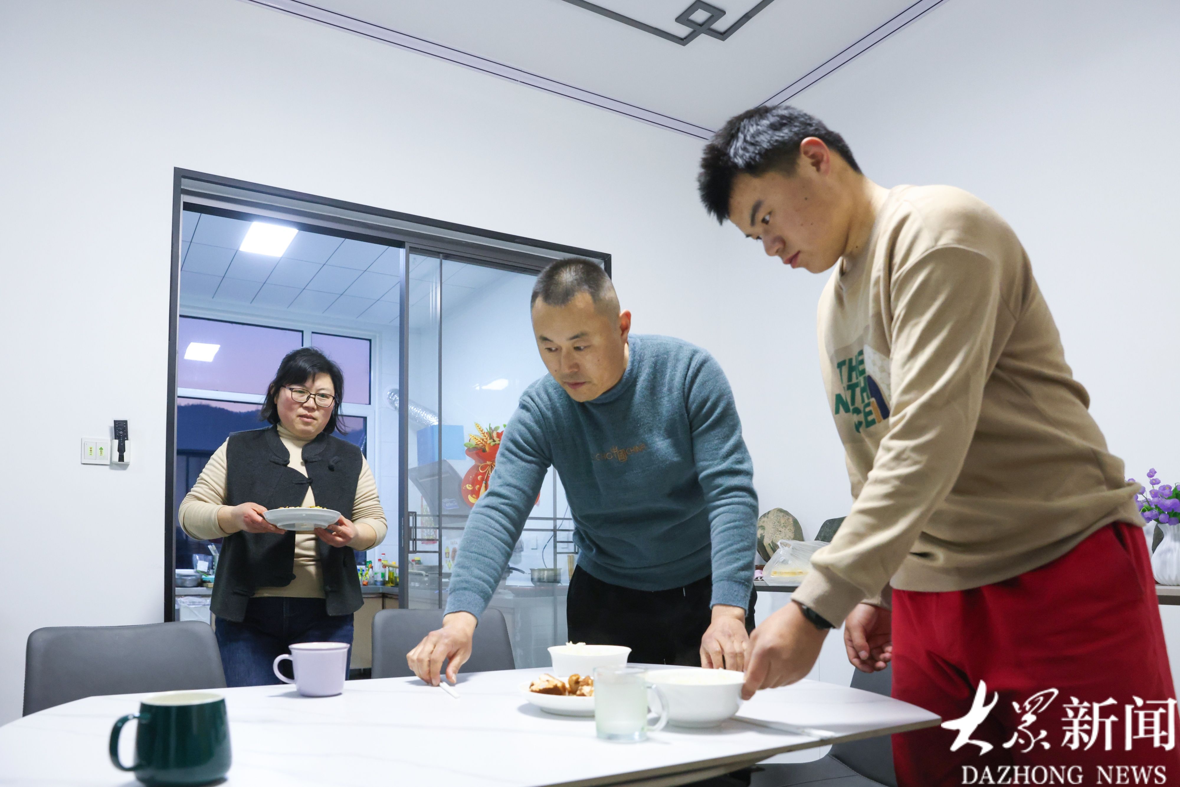 姚国平和儿子收拾餐桌,准备吃饭。姚国平爱人张岩从厨房里端出刚炒好的菜。