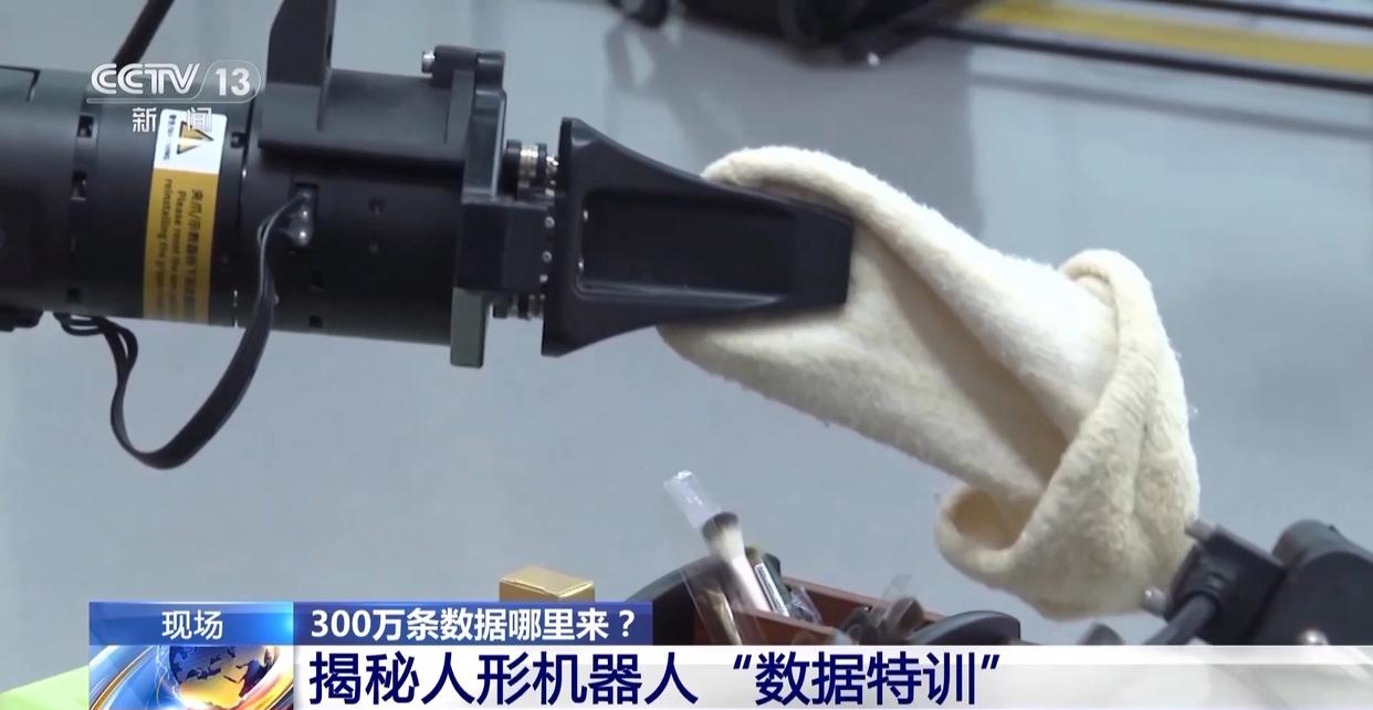 总台记者 马欣欣:在搭建的是“儿童房”的场景中,模型训练师正在操控机器人去把这个反了的袜子给翻过来。完成这些动作的同时,也会实时采集这些机器人关节角度值、运行轨迹等多个数据,一共300到1000次才能完成一个动作的数据采集。