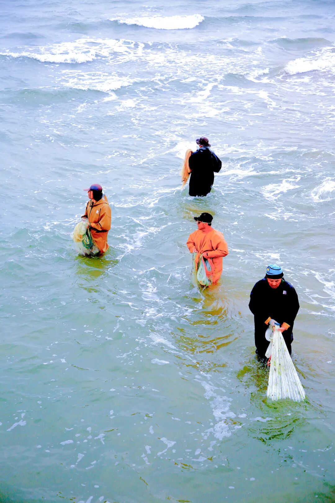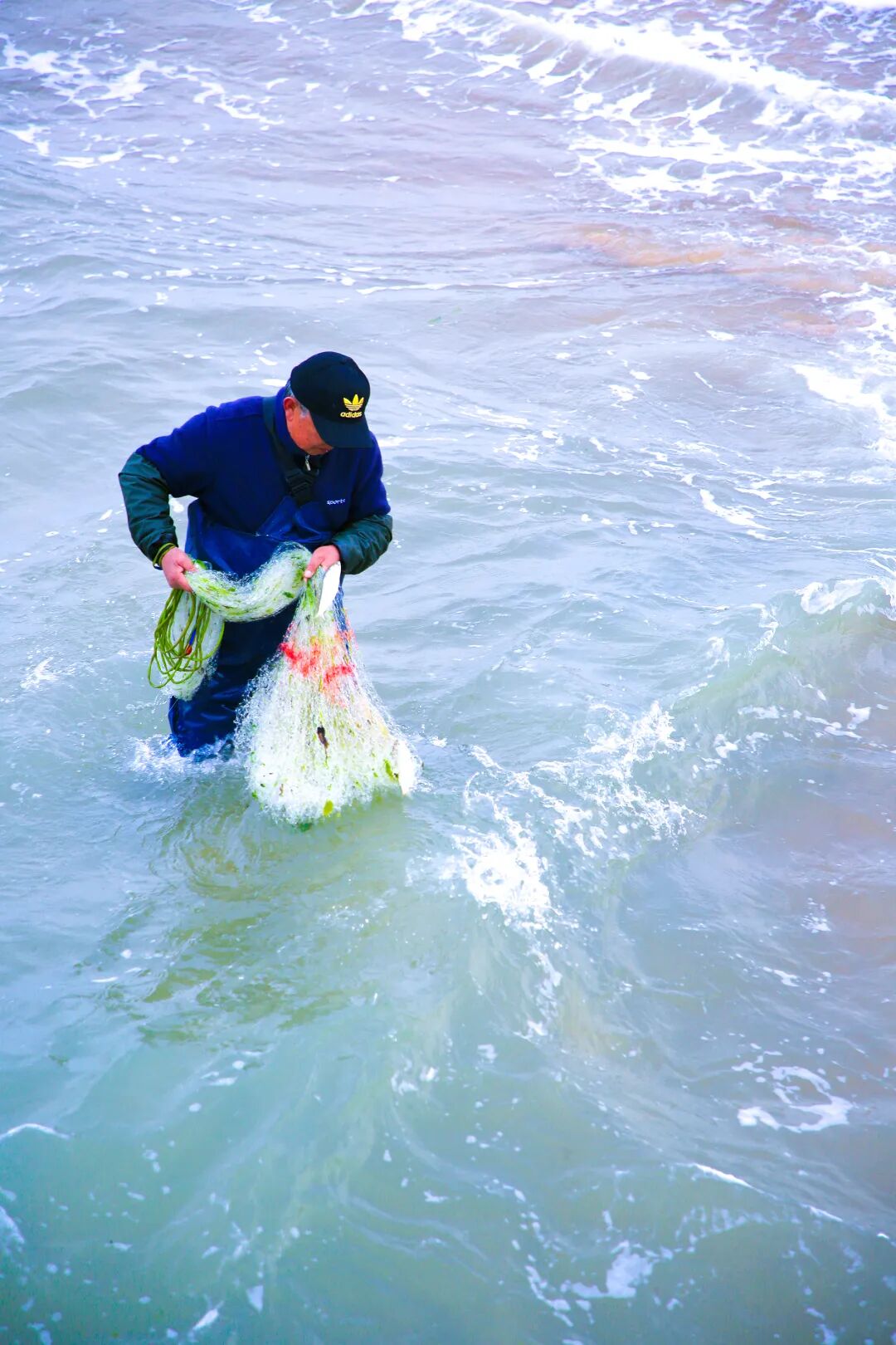 来自附近渔村的10余名经验老道的渔民早已踏浪而来,他们默契地踩着潮汐节奏,或伫立在礁石边缘,或行走于浅滩之上,目光锁定海面鱼群的动静。随着一片片渔网在空中舒展成优美的圆弧,以“天女散花”之势精准覆向鱼群,坠入翻涌的波光里。渔网收网的瞬间,满是活蹦乱跳的梭鱼、海鲫鱼,它们通体银鳞闪耀,在桶中、网间奋力跃动,勾勒出充满生命力的鲜活弧线。