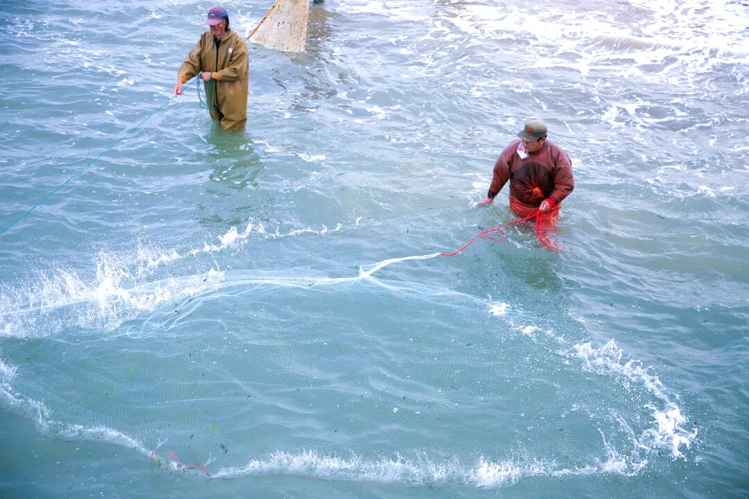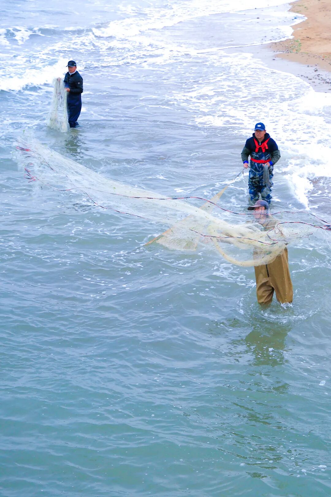 在10多名撒网的渔民中,一位身着黑色防水服、带着墨镜的中年男子格外惹眼。随着水中的挂网离开水面,两条硕大的梭鱼又引起一片欢呼声。一旁的老渔民笑着指着他,向围观人群高声介绍:“这就是咱太公岛的‘鱼王’!一天能捞好几百斤呢!”“嗨,了了的,赶得巧,弄得不多。”