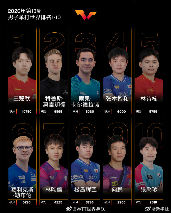 国际乒联公布2026年第13周世界排名:男子单打,中国队球员王楚钦位列第一,林诗栋位列第五,向鹏位列第九。女子单打,中国队球员孙颖莎、王曼昱、陈幸同位列前三,蒯曼位列第六,陈熠位列第七,王艺迪位列第八。