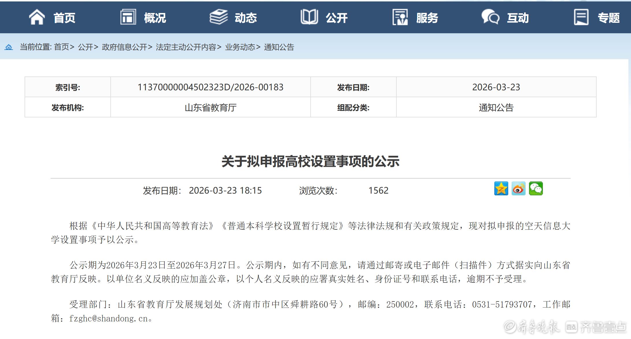 3月23日,山东省教育厅发布《关于拟申报高校设置事项的公示》,正式将空天信息大学的设置事项纳入申报程序。公示期为2026年3月23日至3月27日,期间社会各界可通过规定渠道反馈意见。这标志着全国首所以“空天信息”命名的省属公办本科高校,距离正式建校又迈出了关键一步。