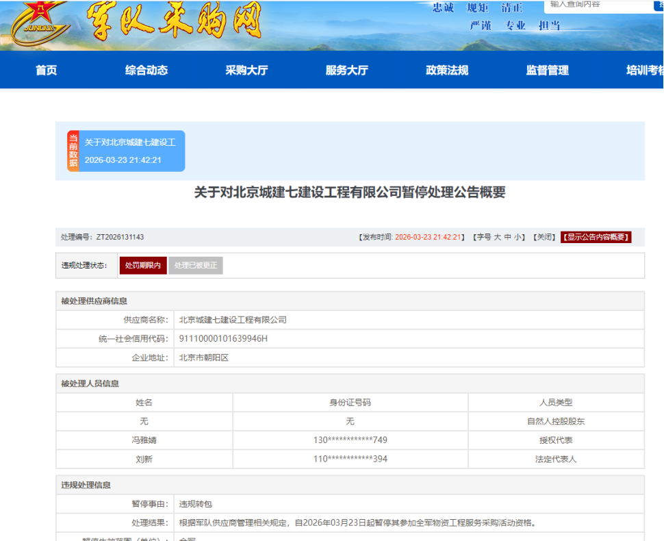 陆军采购管理部门公布的《关于对北京城建七建设工程有限公司暂停处理公告》显示,经调查,北京城建七建设工程有限公司在参加项目编号:2023-JL01-G1031采购活动中,涉嫌存在违规失信行为。根据军队供应商管理相关规定,自2026年03月23日起暂停其参加全军物资工程服务采购活动资格。在暂停期内,法定代表人刘新、自然人控股股东无控股或管理的其他企业暂停参加上述范围军队采购活动,授权代表冯雅婧暂停代理其他供应商参加上述范围军队采购活动。