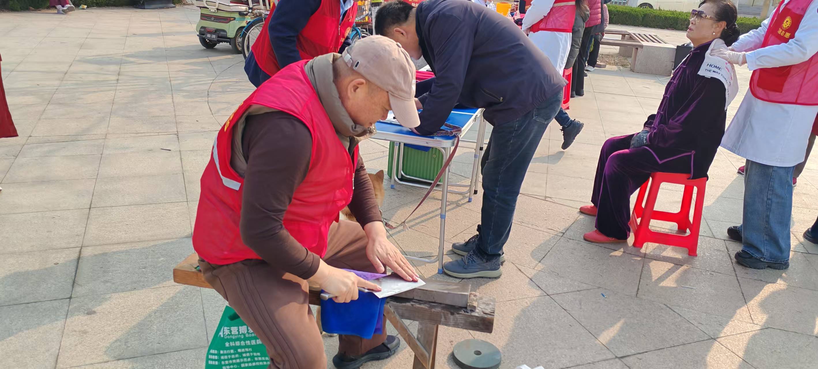 另一侧的生活便民服务区同样热闹非凡,志愿者团队为居民提供免费理发和磨菜刀、剪刀服务。志愿者理发师熟练地为居民修剪发型,满足居民的日常需求;磨剪子锵菜刀的师傅则认真地打磨每一件刀具,让原本钝涩的刀具重新变得锋利。志愿者们热情周到的服务,得到了居民们的一致好评。