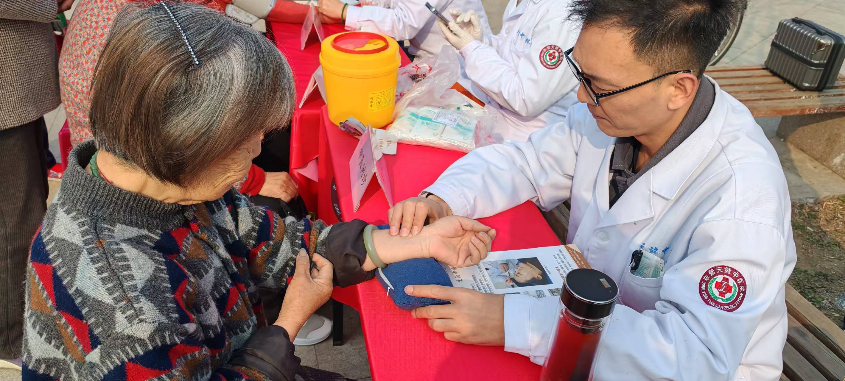 活动现场,天健中医院的医护人员早早便搭建好义诊台,为居民们提供免费的健康服务。医护人员耐心地为每一位居民测量血糖、血压,详细记录数据并给予健康指导;中医专家为居民们把脉问诊,根据居民的身体状况给出个性化的养生建议和诊疗方案;专业的推拿技师则凭借娴熟的手法,为有需求的居民缓解颈肩腰腿等部位的不适,让居民们在社区就能体验到专业的中医诊疗服务。