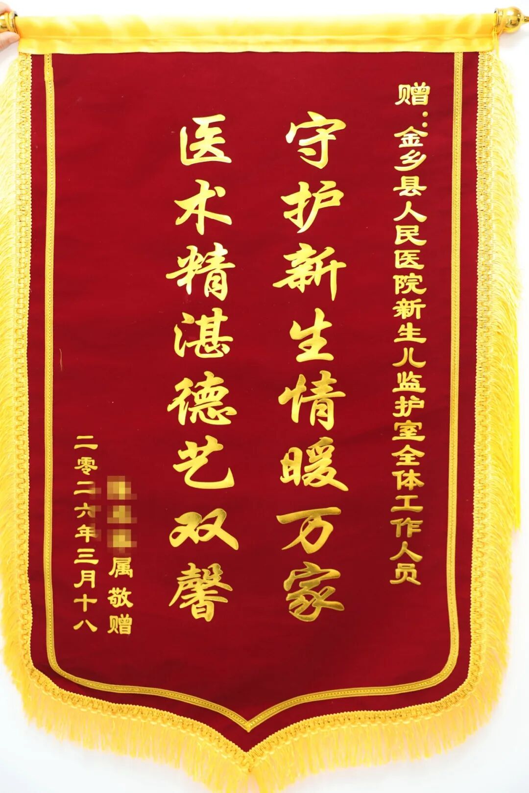近日,金乡县人民医院新生儿重症监护室收到了一面写有"守护新生情暖万家 医术精湛德艺双馨"的锦旗。送来这份心意的,是在新生儿重症监护室接受住院治疗的小瑞瑞(化名)父母。孩子出院时,家人特意送来锦旗,以表达内心深处的感激之情。