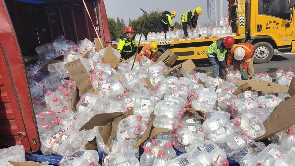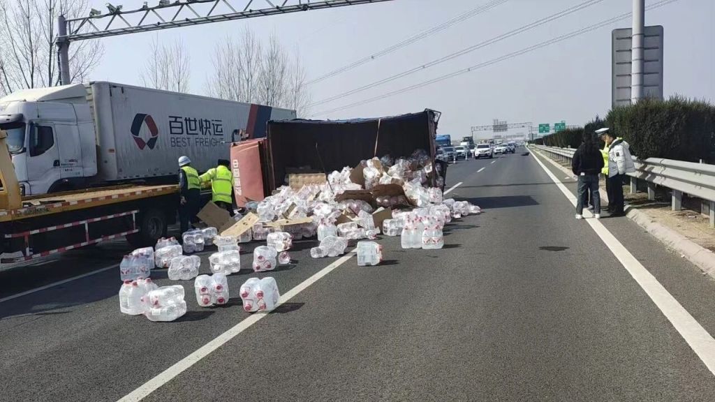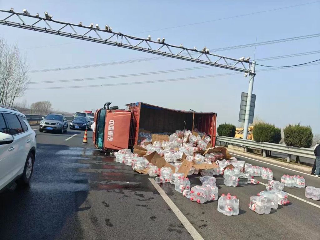 接到报警后,值班人员立即通知巡逻民警及路政部门赶往事故现场进行处置。民警发现,一辆货车侧翻在道路中央,车上装载的矿泉水散落一地,货车驾驶员告诉民警,他从济宁出发到青岛送货,没想到车辆行驶途中右后轮两个轮胎同时脱落,紧接着车辆失控打转,侧翻在路中央,旁边一辆正常行驶的轿车无辜“中招”,被滚落的轮胎砸中,幸运的是货车驾驶员和轿车驾驶员在此次事故中都没有受伤。