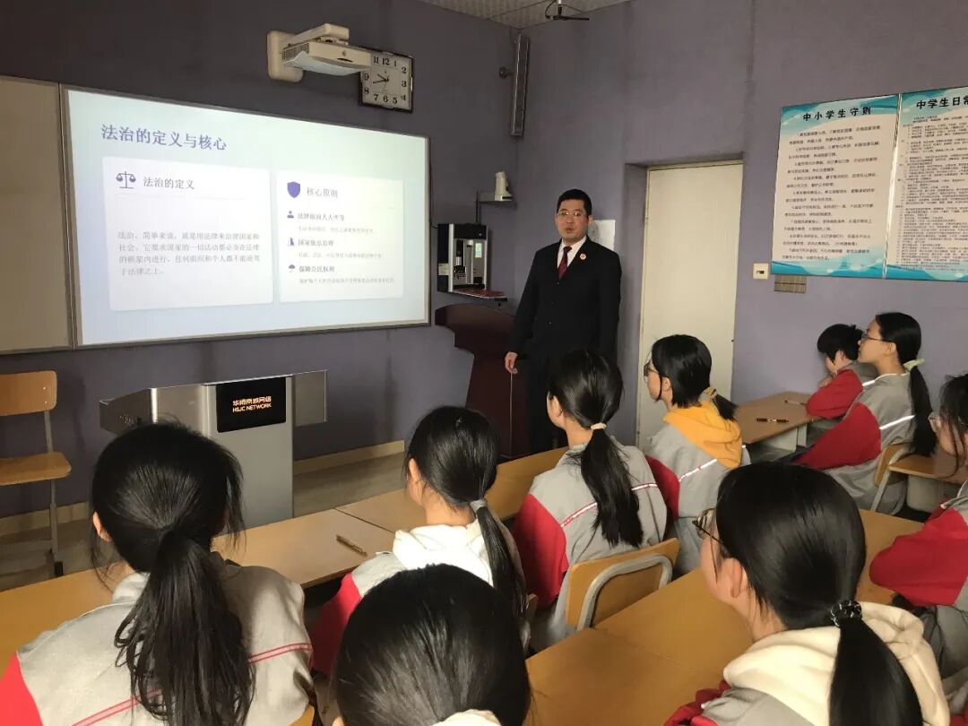 首先阐释了法治的定义与核心原则,明确法律面前人人平等、国家依法治理、保障公民权利的法治内核,让同学们明白法治与日常生活息息相关。随后,结合校园场景,讲解了遵守课堂纪律、爱护公共财物、遵守交通规则等行为背后的法律内涵,指出校园中的日常行为既关乎校规校纪,更与法律权利义务紧密相连。在宪法权利讲解环节,重点介绍了受教育权、生命健康权、人格尊严权、隐私权等未成年人的核心权利,着重强调校园欺凌是对他人生命健康权与人格尊严权的严重侵害,引导同学们学会认清自身权利、尊重他人权利。