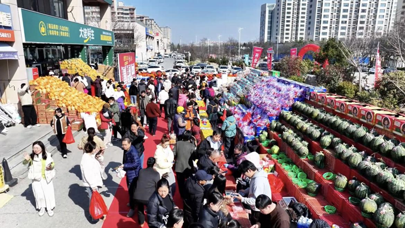 在莱西市,一家名为“大佬鲜生”的生鲜超市自3月13日开业以来,持续上演着“开门红”的盛况:日均到店顾客突破1万人次,开业首日线上订单量高达2万单。一间仅百余平方米的店面,两侧“水果墙”上摆满了来自天南海北的时令水果,店员穿梭其间引导顾客、分装拼盘、收银结算,不少货架前和收银台前都排起了长队。开业至今已逾一周,这股热潮仍未消退。