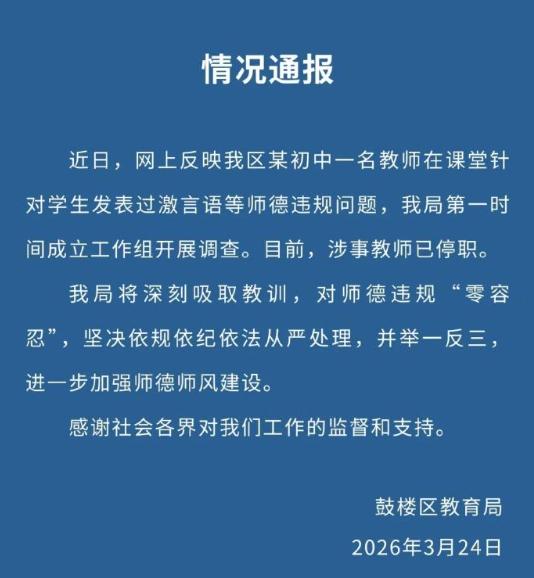 南京市鼓楼区教育局3月24日通报,近日,网上反映鼓楼区某初中一名教师在课堂针对学生发表过激言语等师德违规问题,该局第一时间成立工作组开展调查。目前,涉事教师已停职。鼓楼区教育局将深刻吸取教训,对师德违规“零容忍”,坚决依规依纪依法从严处理,并举一反三,进一步加强师德师风建设。(南京市鼓楼区教育局)