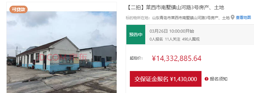 近日,京东司法拍卖平台显示,莱西市南墅镇山河路3号房产、土地将于3月26日进行二次法拍,起拍价约1433万元,保证金143万万元,加价幅度7.1万元。据了解,该标的物所有人为青岛元合建材有限公司。