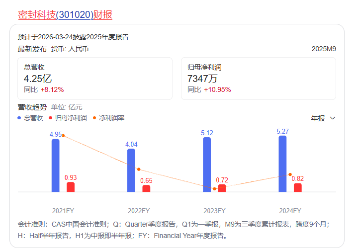 3月23日晚间,密封科技(301020.SZ)发布的2025年年报显示,2025年实现营业收入5.62亿元,同比增长6.60%;归属于上市公司股东的净利润8850.50万元,同比增长8.07%;归属于上市公司股东的扣非净利润为8705.47万元,同比增长11.16%;经营活动产生的现金流量净额1.00亿元,同比增长29.04%;基本每股收益0.60元,同比增长7.14%。公司拟以14640万股为基数,向全体股东每10股派发现金红利1.8元(含税),不送红股,不以资本公积金转增股本。