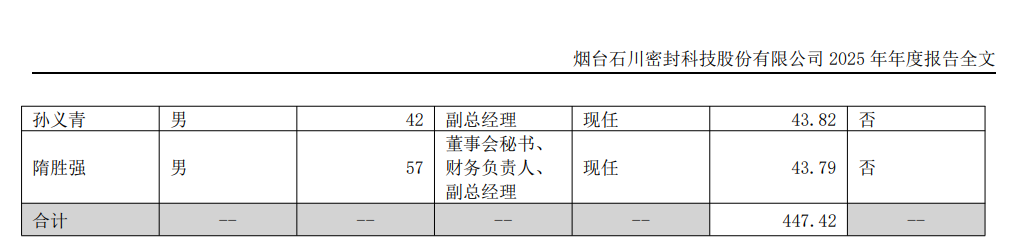 2025年年报显示,密封科技董事和高级管理人员合计领取报酬447.42万元。其中,公司董事长公维军薪酬最高为86.76万元,公司总经理、董事王平领取薪酬84.84万元。