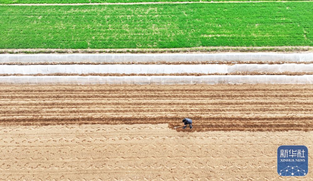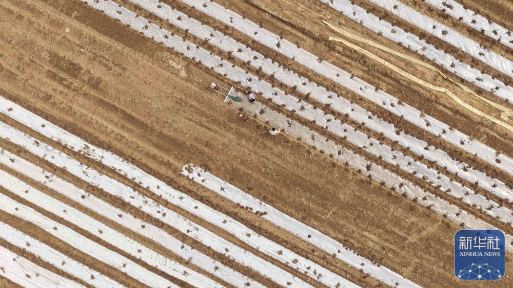 ↑ 3月23日,在山东省临沂市郯城县郯城街道,农民在田间劳作(无人机照片)。新华社发(张春雷 摄)
