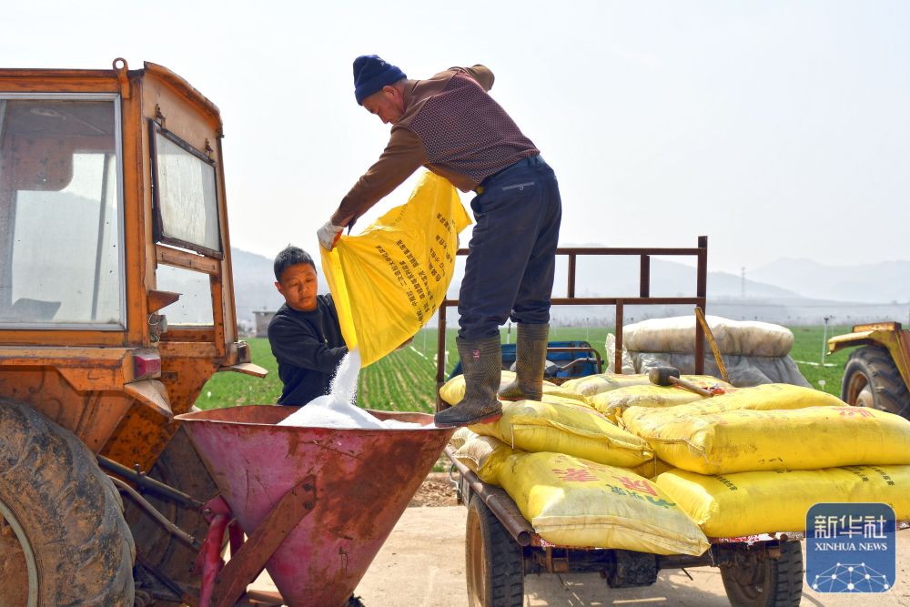 ↑ 3月23日,在山东省烟台市福山区高疃镇,农民准备为小麦施肥。新华社发(孙文潭 摄)