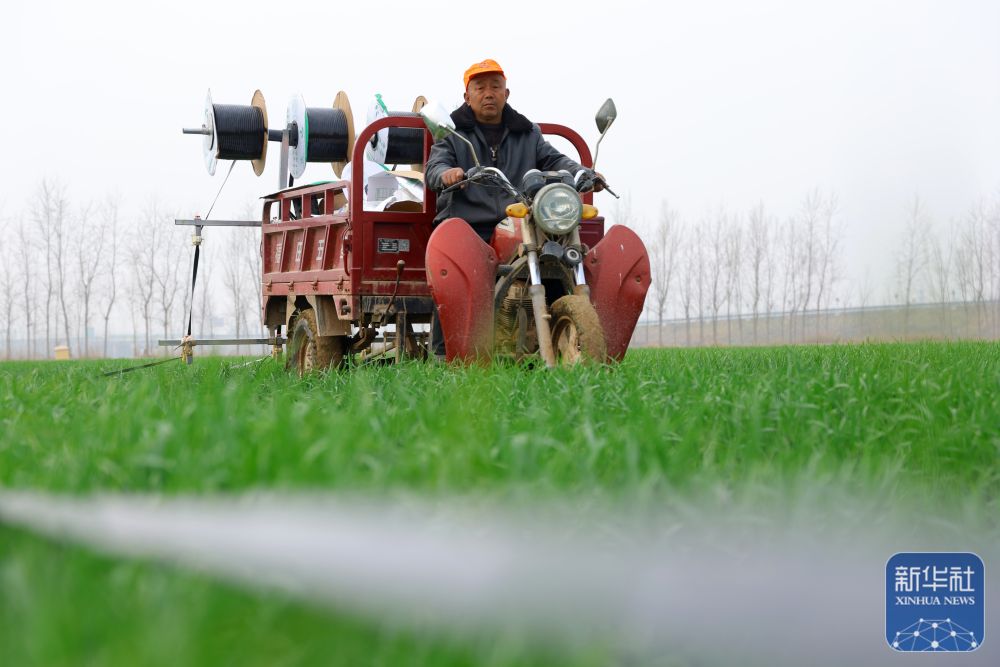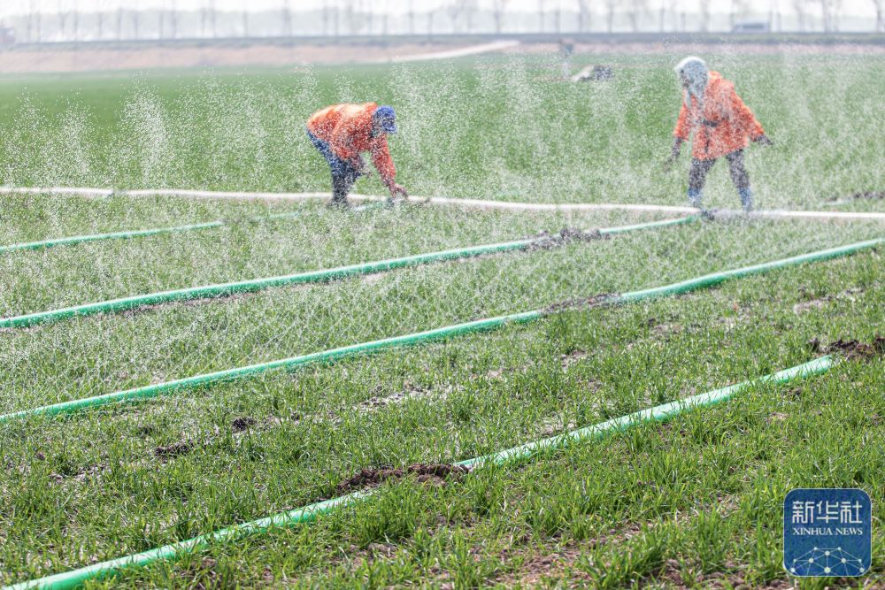 ↑ 3月23日,在山东省聊城市茌平区冯官屯镇,农民给小麦铺设滴灌带。新华社发(马红坤 摄)