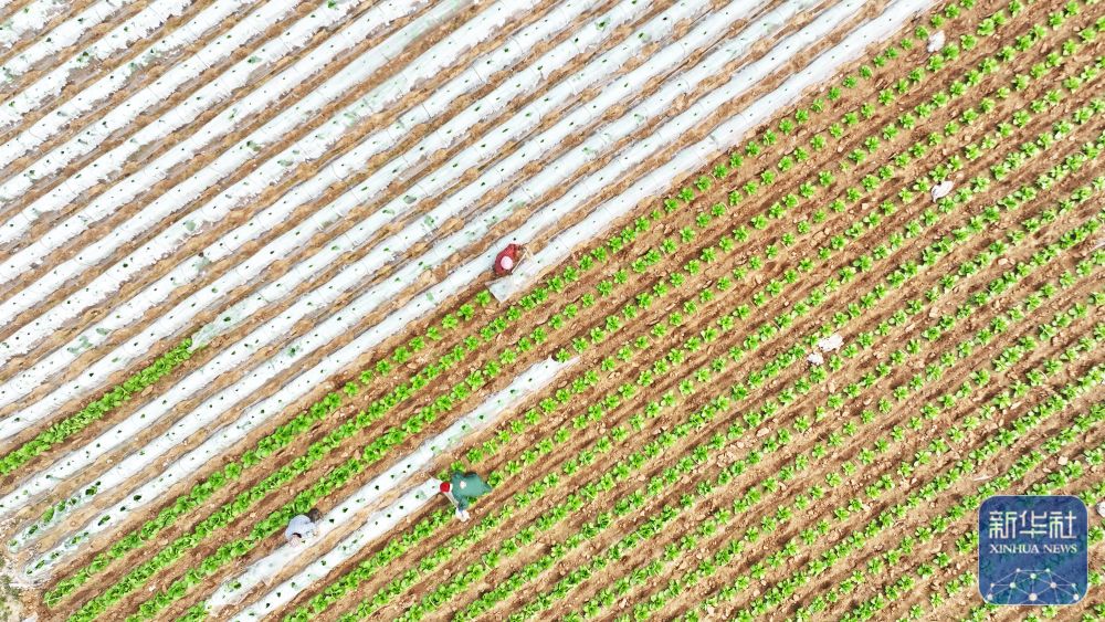 ↑ 3月23日,在山东省临沂市郯城县郯城街道,农民在蔬菜种植基地劳作(无人机照片)。新华社发(张春雷 摄)