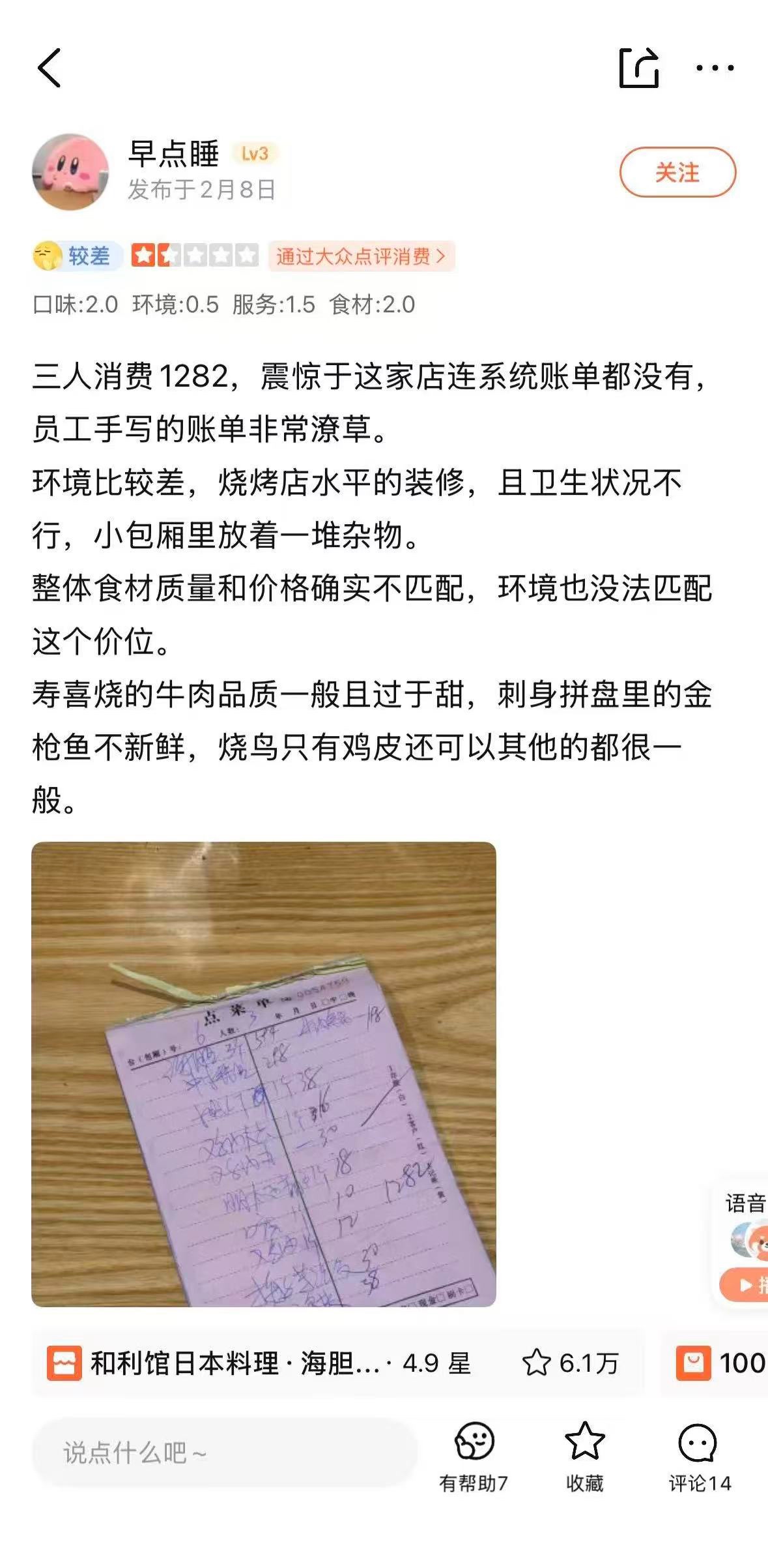 更让消费者不满的是,店家仅出示潦草手写单据,未主动提供清晰打印明细。双方现场争执不下,彭女士已向市场监管部门投诉维权,并留存相关证据。她质疑,这家自称经营十余年的“老店”,靠热情接待、赠送小菜博取好感,却在委托配菜时刻意隐瞒价格,套路消费者,涉嫌变相宰客。此外,有网友翻出平台评价,称曾有其他消费者在该店消费四千余元,类似争议并非个例。针对此事,涉事店主田先生称,所有菜品均为消费者查看菜单后自主点选,店内明码标价,定价符合经营标准,不存在宰客行为。店家列出详细账单:6片金枪鱼刺身398元、6片三文鱼刺身98元、马粪海胆198元/只、鸡肉大葱串16元/个、牛舌118元、烤活鳗鱼118元、刀鱼刺身298元等,总价核算无误。一方坚持“托付安排、未告知价格”,一方坚称“顾客自点、明码标价”,双方各执一词,争议持续发酵。