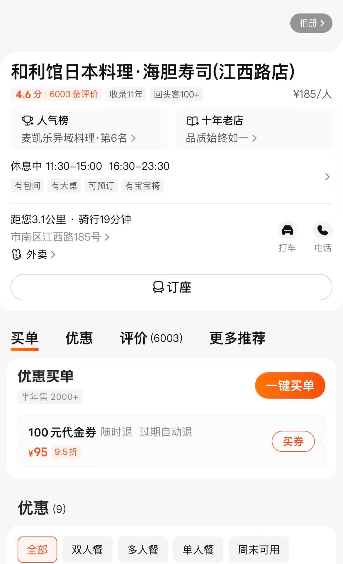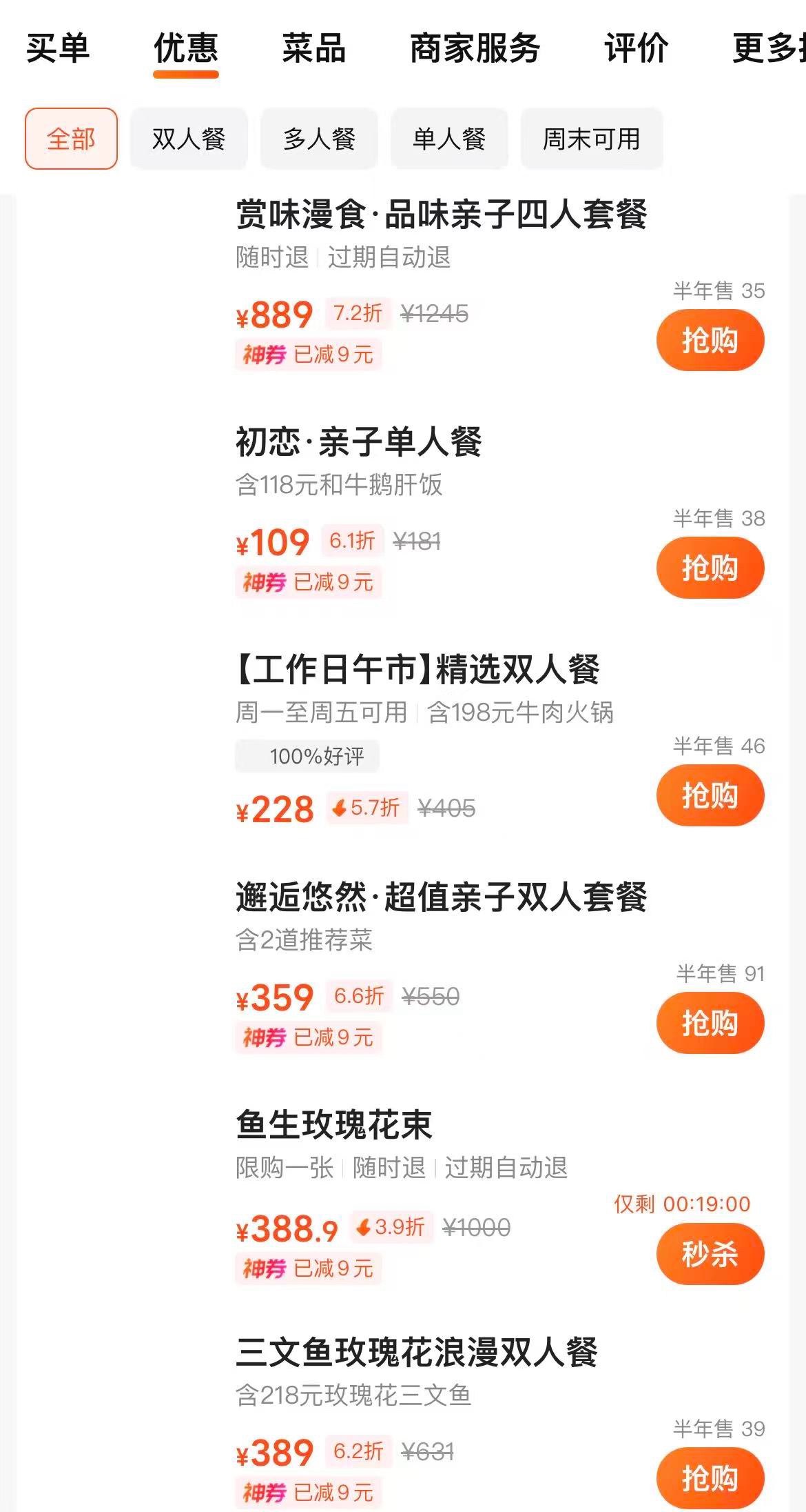 记者在大众点评、美团等平台搜索该店发现,该店标注的人均消费为185元;三文鱼玫瑰花浪漫双人餐为389元,超值亲子双人套餐359元,工作日午市精选双人餐标价228元。其中亲子双人餐包含芥末章鱼、刺身拼盘、火炙三文鱼沙拉、火炙三文鱼腩寿司、火炙牙片鱼裙边寿司、三菇锅、猪排咖喱饭、大虾天妇罗、北海道甜品以及饮品等多款菜品,与彭女士消费的1600元双人餐价格差距较大。