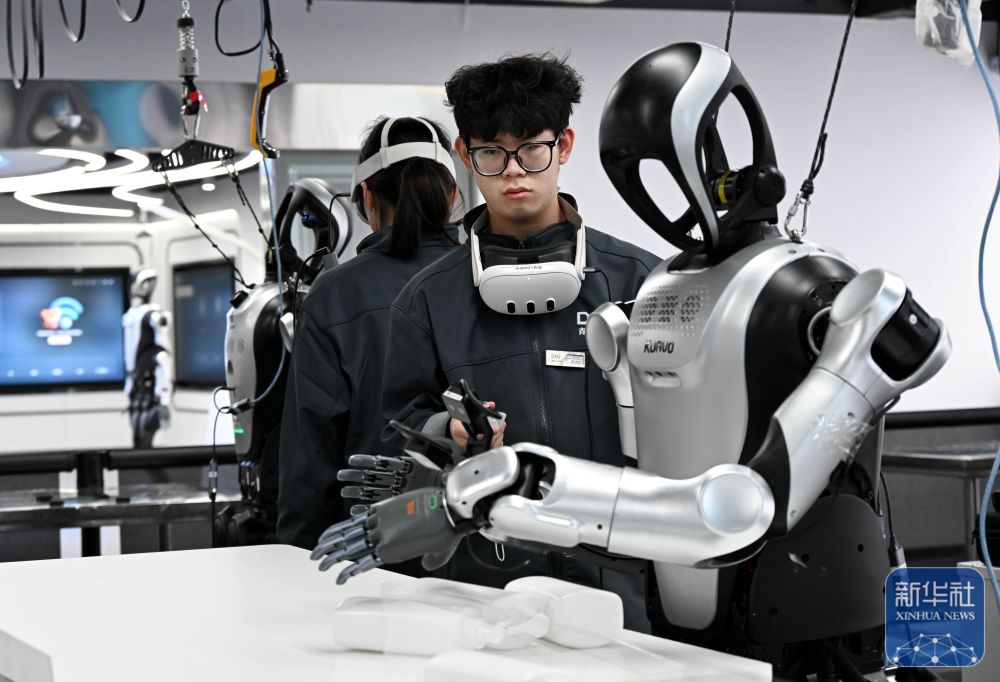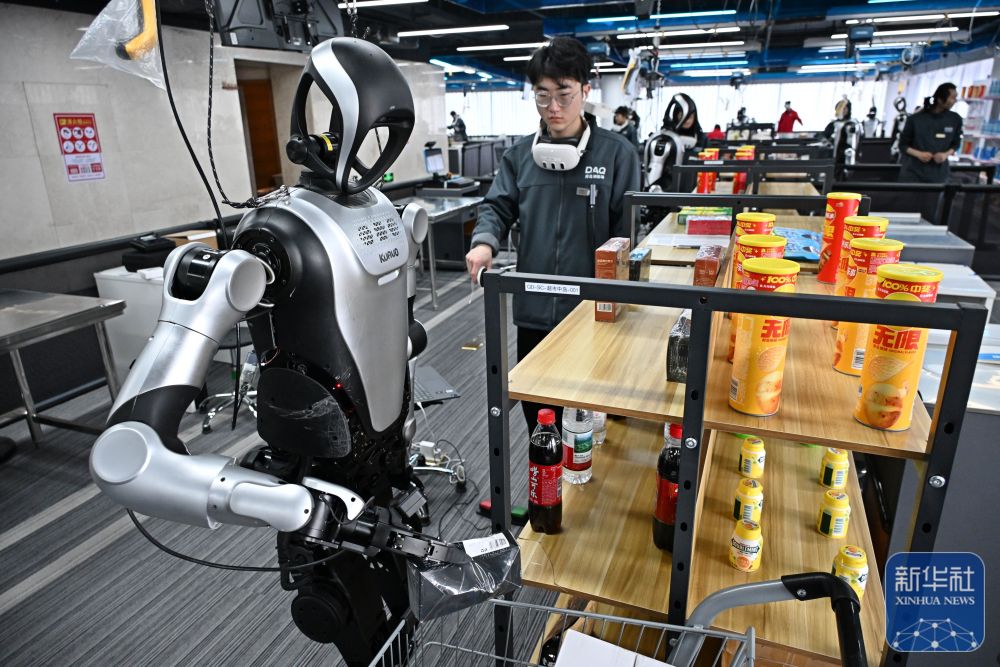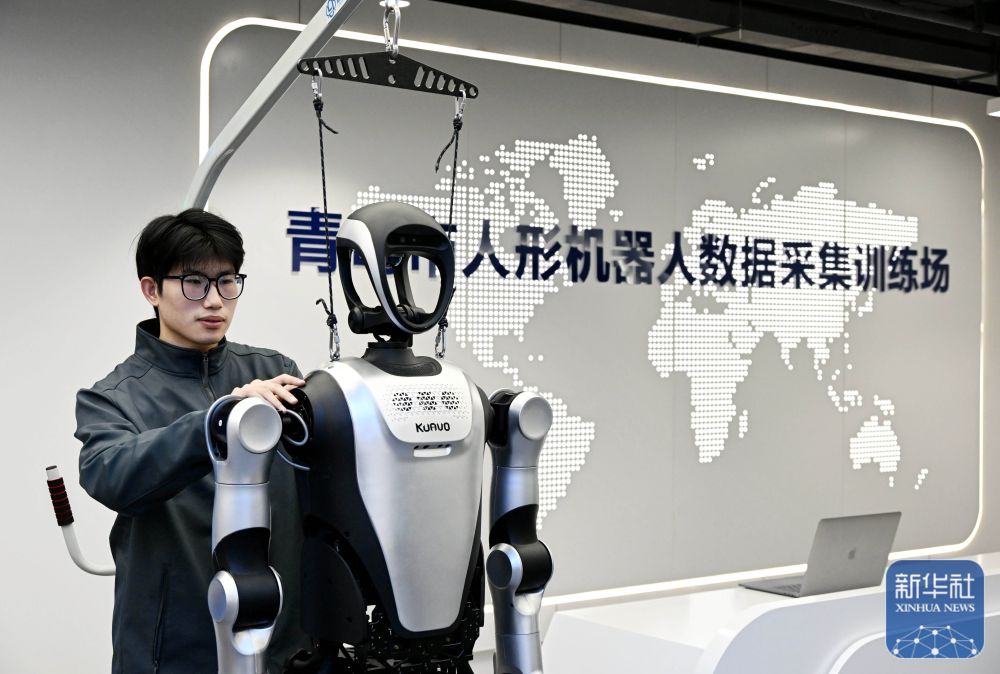 山东青岛:人形机器人“岗前培训”忙 ↑ 3月23日,在青岛市人形机器人数据采集训练场,工作人员对人形机器人进行训练和数据采集。