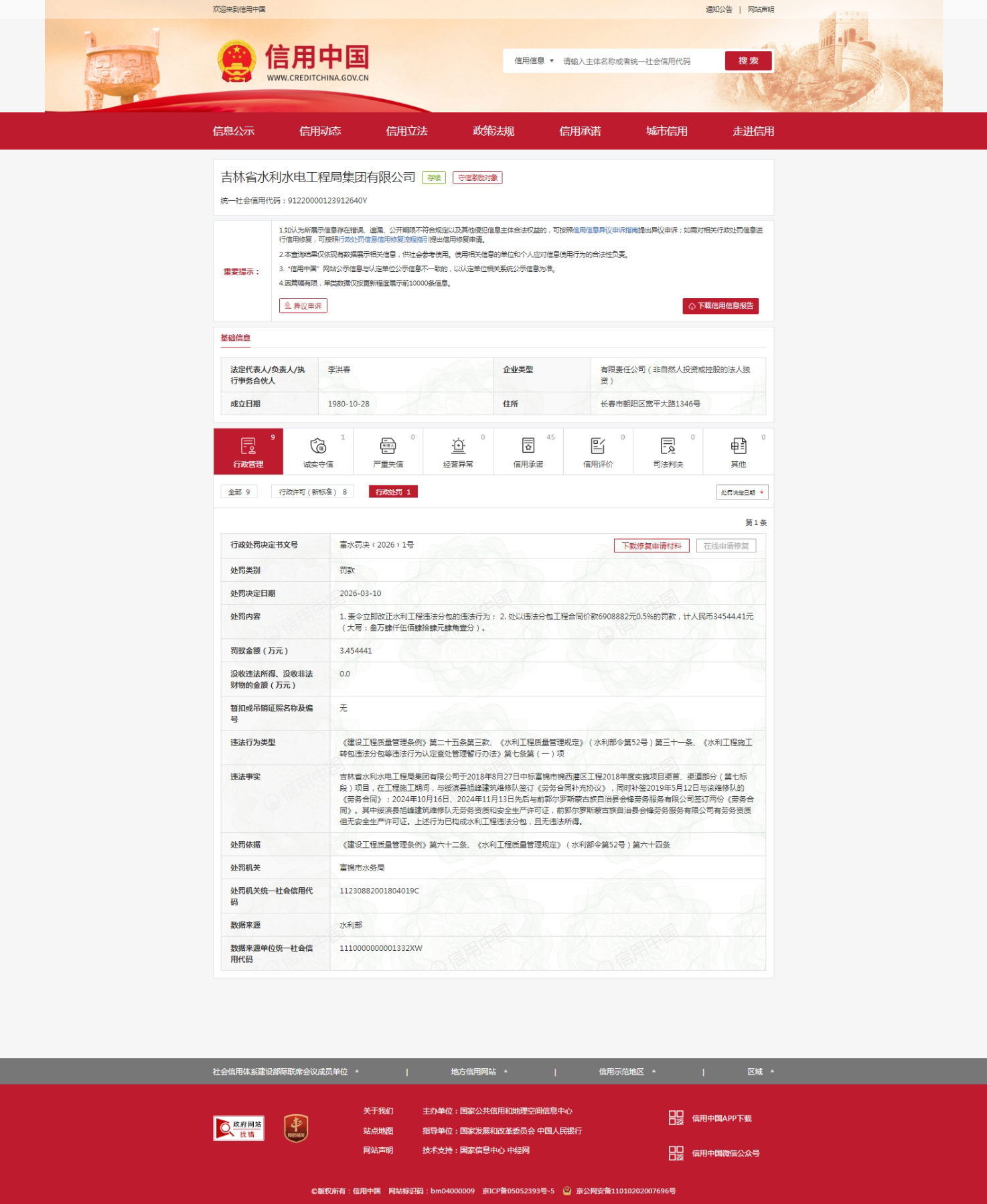 齐鲁晚报·齐鲁壹点记者于信用中国行政处罚信息栏获悉,3月10日,吉林省水利水电工程局集团有限公司(下称“吉林省水利水电工程局”)因涉“水利工程违法分包”收到罚单,处罚机关为富锦市水务局。