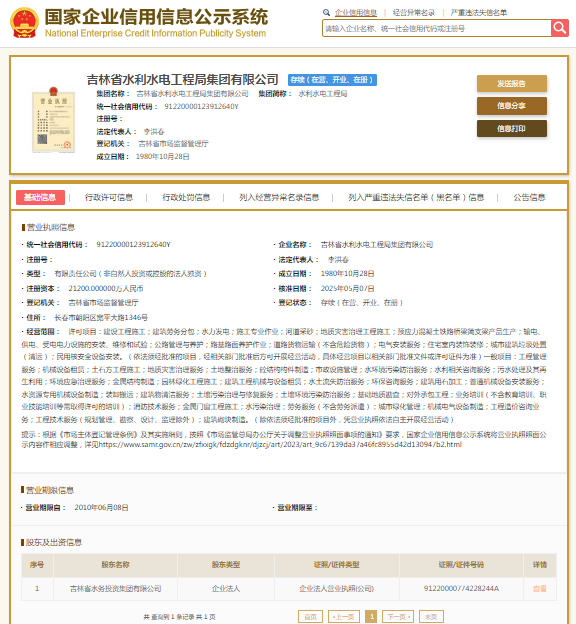 国家企业信用信息公示系统显示,吉林省水利水电工程局集团有限公司成立于1980年,注册资本21200万元人民币,法定代表人为李洪春,由吉林省水务投资集团有限公司全资持股。