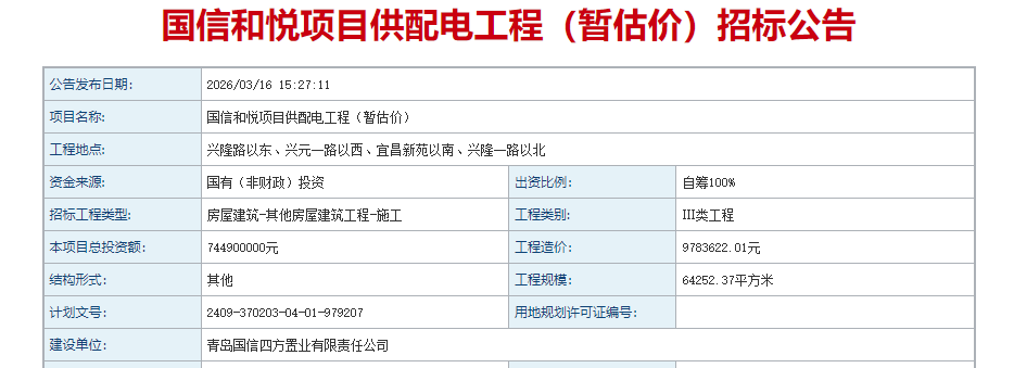 近日,国信和悦项目供配电工程(暂估价)招标公告发布,工程地点位于兴隆路以东、兴元一路以西、宜昌新苑以南、兴隆一路以北,建设单位为国信四方置业有限责任公司。