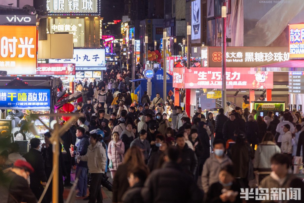 3月23日晚,青岛台东步行街,许多市民与游客来到这里休闲游玩,感受青岛春夜的人气与热闹。