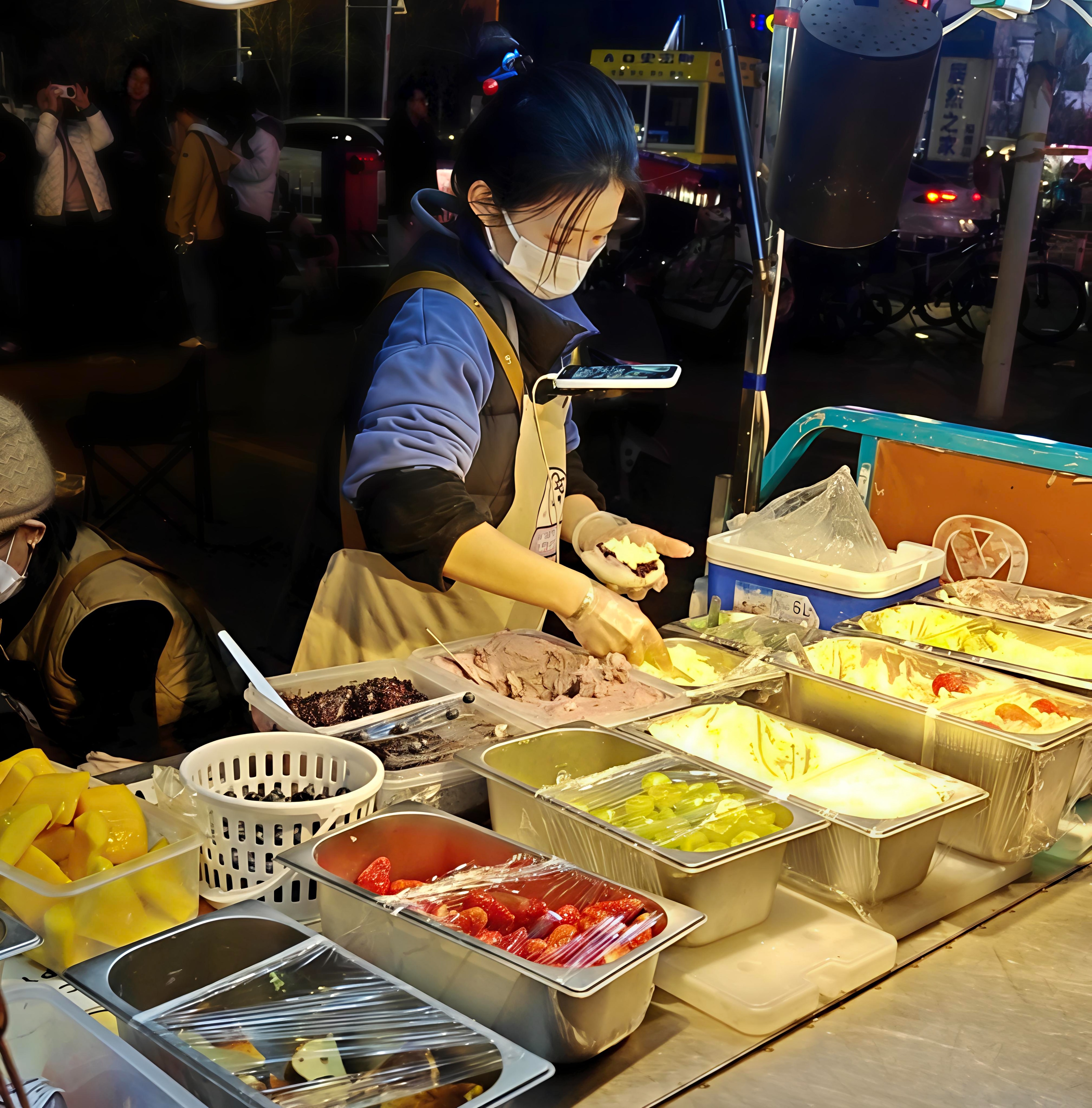 榴莲飞饼商户梁先生现场表演“飞饼”技艺,面饼在空中旋转翻飞,吸引不少市民驻足拍摄、购买。他坦言,规范化的夜市为手艺人提供了展示平台,也让小生意有了稳定去处。夜市中不少商户是夫妻档、父子档、兄弟档经营,灵活就业的模式,为一个个家庭增添了收入来源。