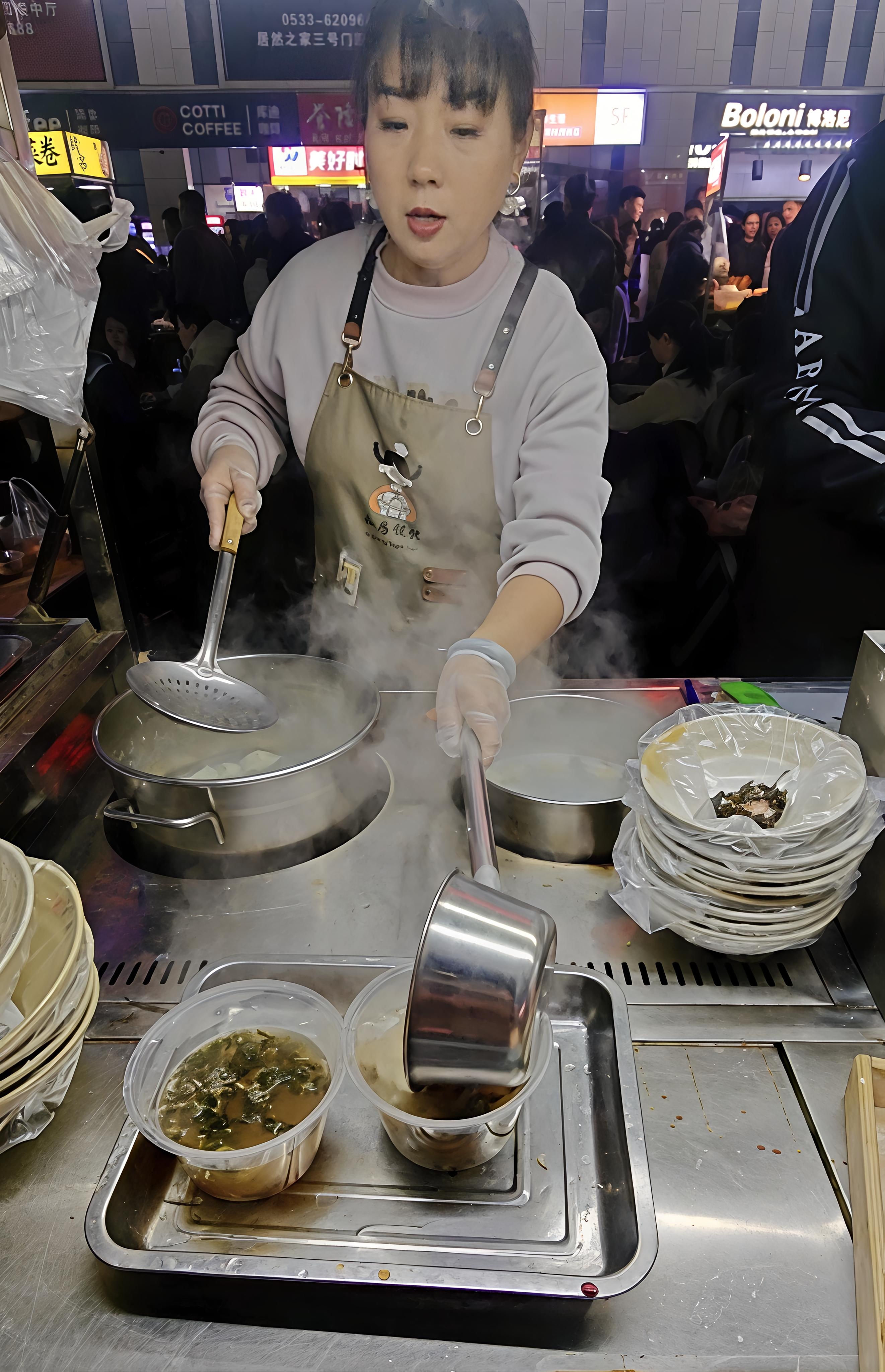 3月23日晚7点,市民陈晓娟和朋友专程前来排队购买“网红”糍粑,她笑着说:“这排的不是队,是咱淄博的烟火气!”傍晚5点后,商场停车场清场完毕,商户们陆续进场摆摊,7点至9点迎来客流高峰,不少摊位前大排长龙,现场秩序井然。