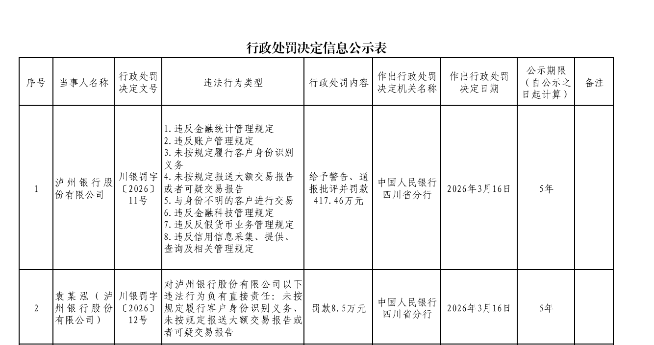 业绩亮眼的同时,泸州银行合规承压。3月20日,中国人民银行四川省分行披露行政处罚信息显示,泸州银行因存在8项违法违规行为,被给予警告、通报批评并罚款417.46万元,同时10名相关责任人被同步追责罚款,合计被罚35万元。