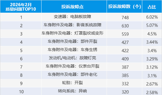 还值得一提的是,汽车的变速箱电脑板故障成为今年2月最突出的质量问题,从TOP10投诉故障点榜单中可以看到,“变速箱电脑板故障”排名一举跃升至首位,投诉故障数达到748个,占比达到6.02%。