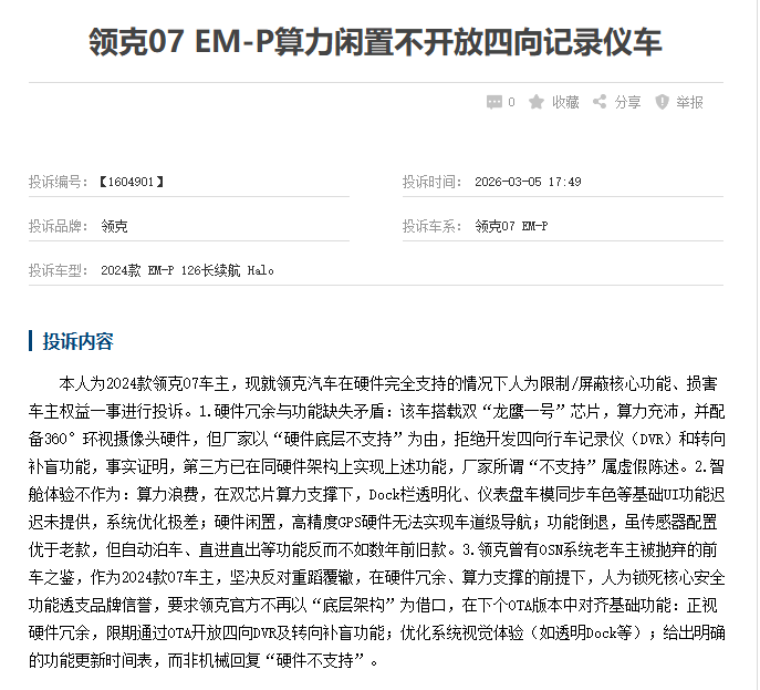 车质网数据显示,领克车主投诉核心为系统升级承诺不兑现、硬件功能被人为限制等。就拿领克07 EM-P来说,多名车主反映,该车搭载双“龙鹰一号”芯片,算力充沛,并配备360°环视摄像头硬件,但厂家以“硬件底层不支持”为由,拒绝开发四向行车记录仪(DVR)和转向补盲功能,,涉嫌虚假宣传。车主还进一步解释道,已有第三方技术力量在同硬件架构车上实现上述功能,厂家所谓的“不支持”属于虚假陈述。另外,双芯片算力下,Dock栏透明化、仪表盘车模同步车色等基础UI功能迟迟不给,系统优化较差。