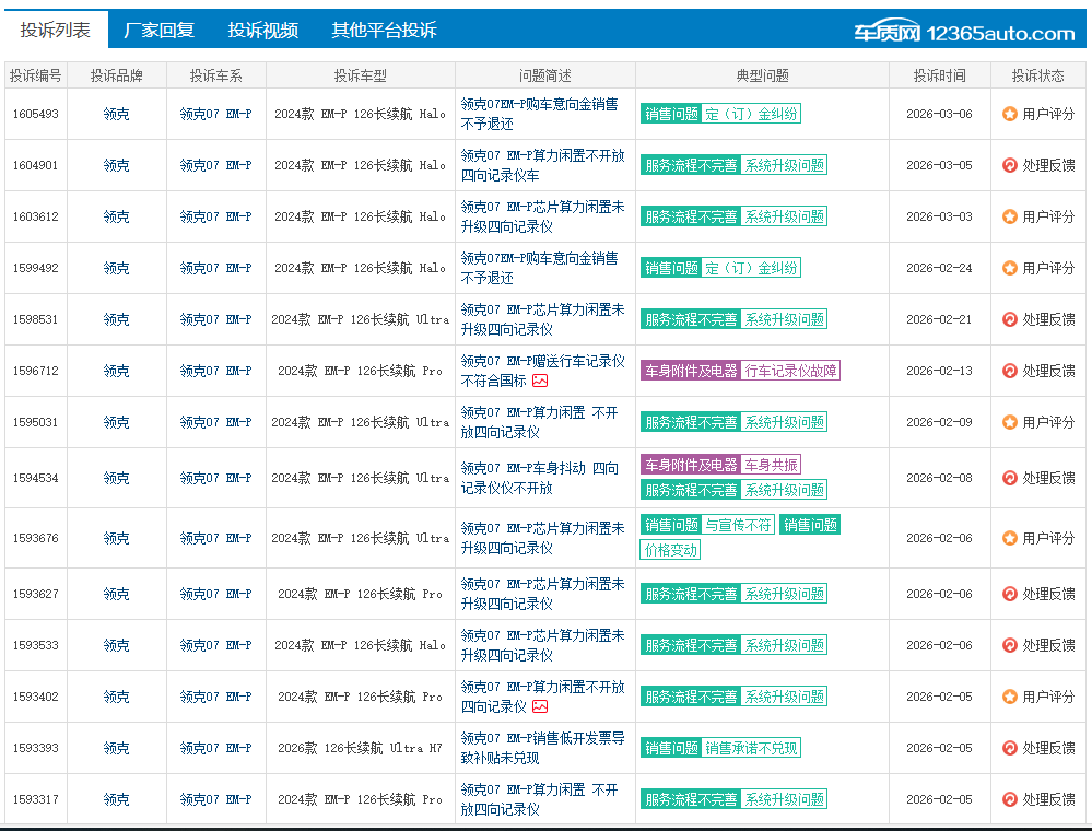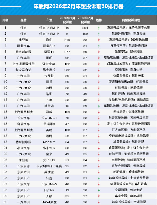 日前,国内知名的汽车投诉网站“车质网”发布了2026年2月的车型投诉排行榜单,从榜单前30名排行来看,领克汽车表现“突出”,领克08 EM-P与领克07 EM-P位列前两名,包揽排行榜的“冠亚军”,而主要原因是“系统升级问题”与“服务承诺不兑现”。