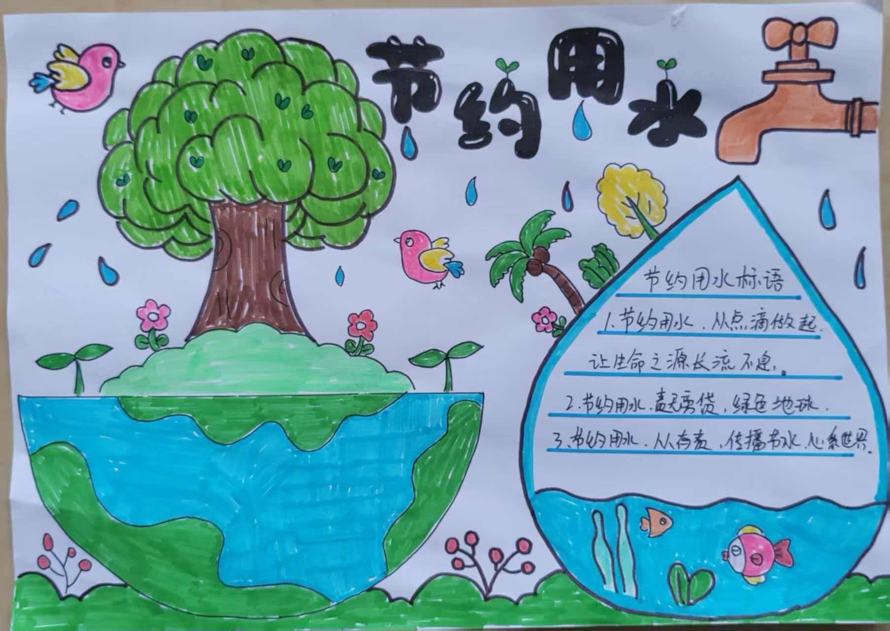 低年级的同学们以手抄报或者绘画的形式,纷纷制作“宣传标语”,卫生间、厨房等到处可见同学们亲手制作的宣传标语,用这样的方式,呼吁家人一起节约用水,用小手拉起大手,共同爱护水资源;高年级的同学们践行废水再利用,洗脸水用后可以清洁地面,然后冲厕所,使用厨卫循环用水桶,收集洗菜水、淘米水,给花草树木浇水,时刻关紧水龙头,做到废水再利用,争做节水小卫士。