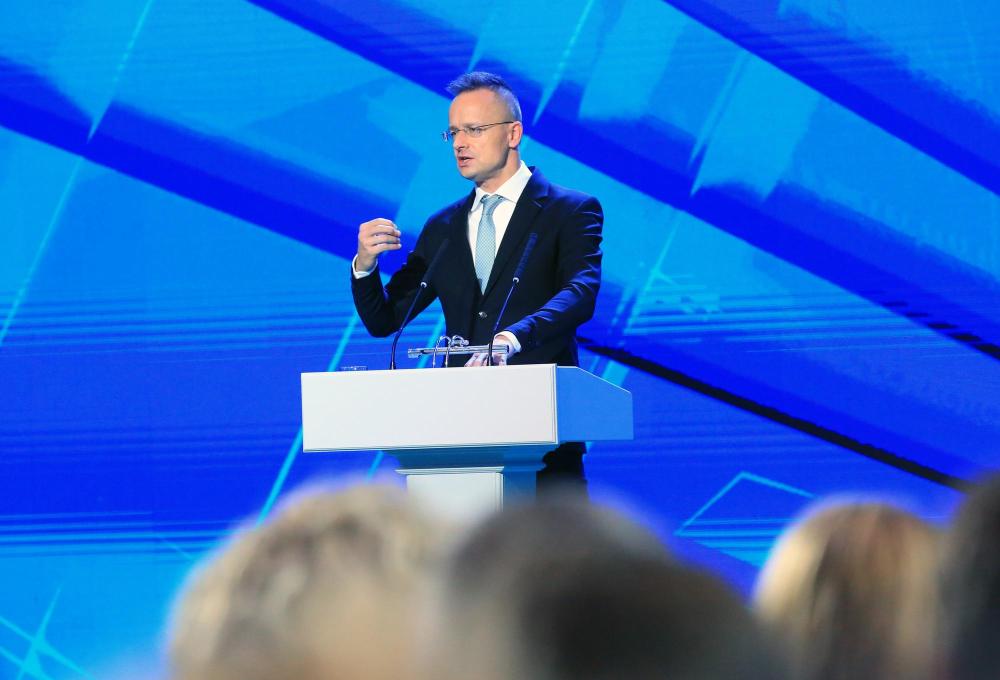 2023年10月26日,匈牙利外长西雅尔多在白俄罗斯首都明斯克举行的“欧亚安全:转型世界的现实与前景”高级别国际会议上发言。新华社发(任科夫摄)