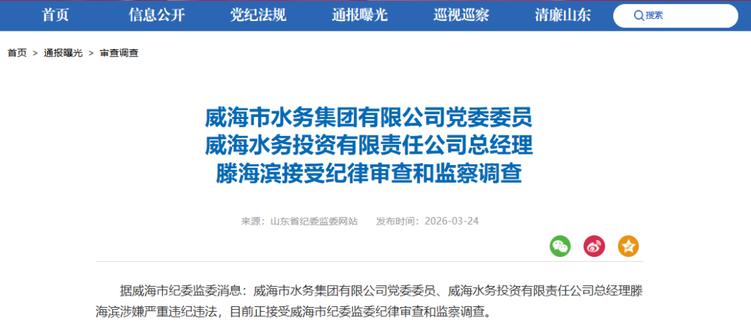 据威海市纪委监委消息:威海市水务集团有限公司党委委员、威海水务投资有限责任公司总经理滕海滨涉嫌严重违纪违法,目前正接受威海市纪委监委纪律审查和监察调查。
