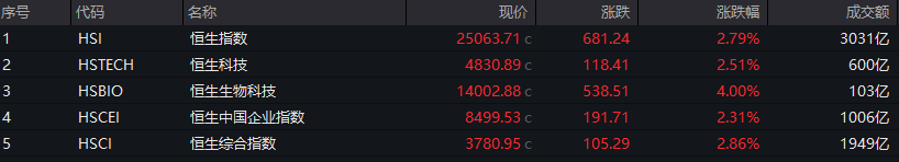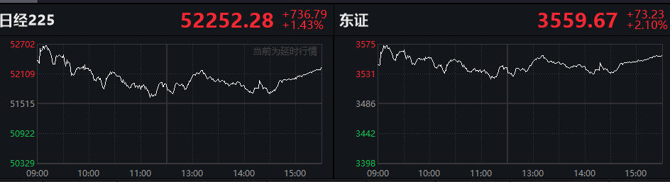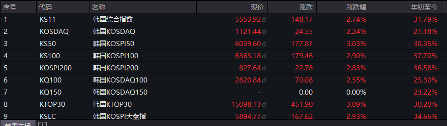 值得注意的是,亚太主要股指午后也集体走强,港股市场今日迎普涨行情,港股恒生指数、恒生科技指数涨超2.5%,日韩股市集体收涨,日经225指数涨1.43%报52252.28点;韩国KOSPI指数涨2.74%报5553.92点。
