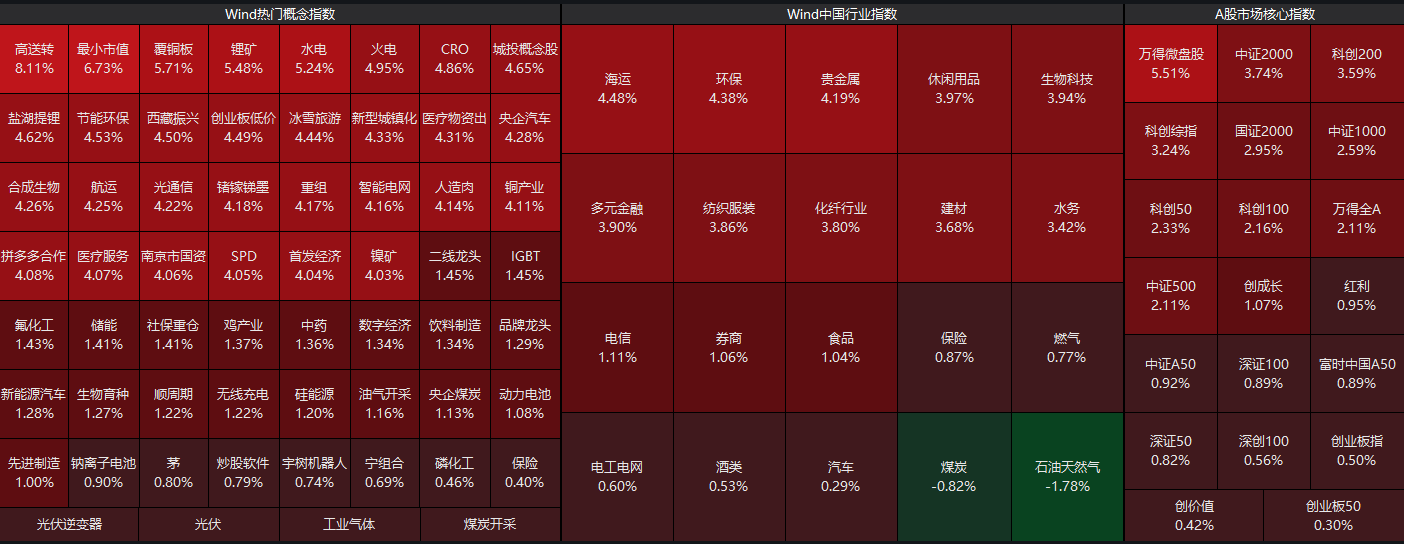 板块题材上,军工、环保设备、绿色电力、CRO概念、体育产业、工业金属、港口航运、光纤概念、房地产、化学纤维、PCB概念股涨幅居前。