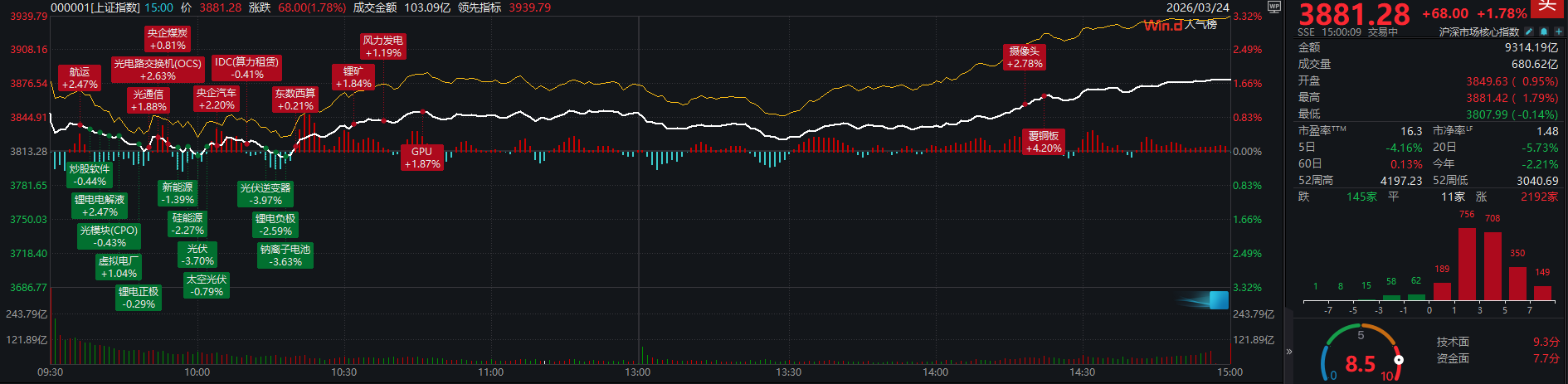 3月24日,市场全天探底回升,沪指、深成指均涨超1%,创业板指尾盘翻红,此前一度跌近2.5%。截至收盘,沪指报3881.28点,涨1.78%,深成指报13536.56,涨1.43%,创指报3251.55点,涨0.50%。沪深两市全天成交额2.08万亿,较上一个交易日缩量3487亿。