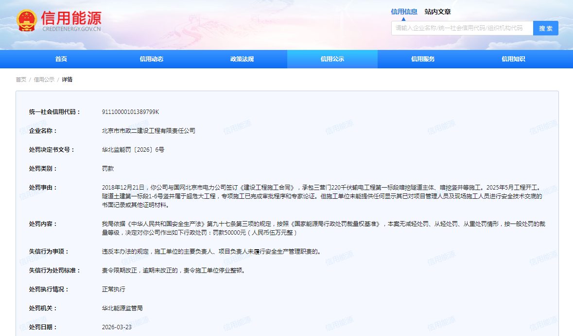 齐鲁晚报·齐鲁壹点记者于信用能源信用公示栏获悉,3月23日,北京市政建设集团旗下的北京市市政二建设工程有限责任公司(下称“北京市政二公司”)、北京市市政四建设工程有限责任公司(下称“北京市政四公司”)同日收到罚单,处罚机关均是华北能源监管局,处罚执行情况均为正常执行。