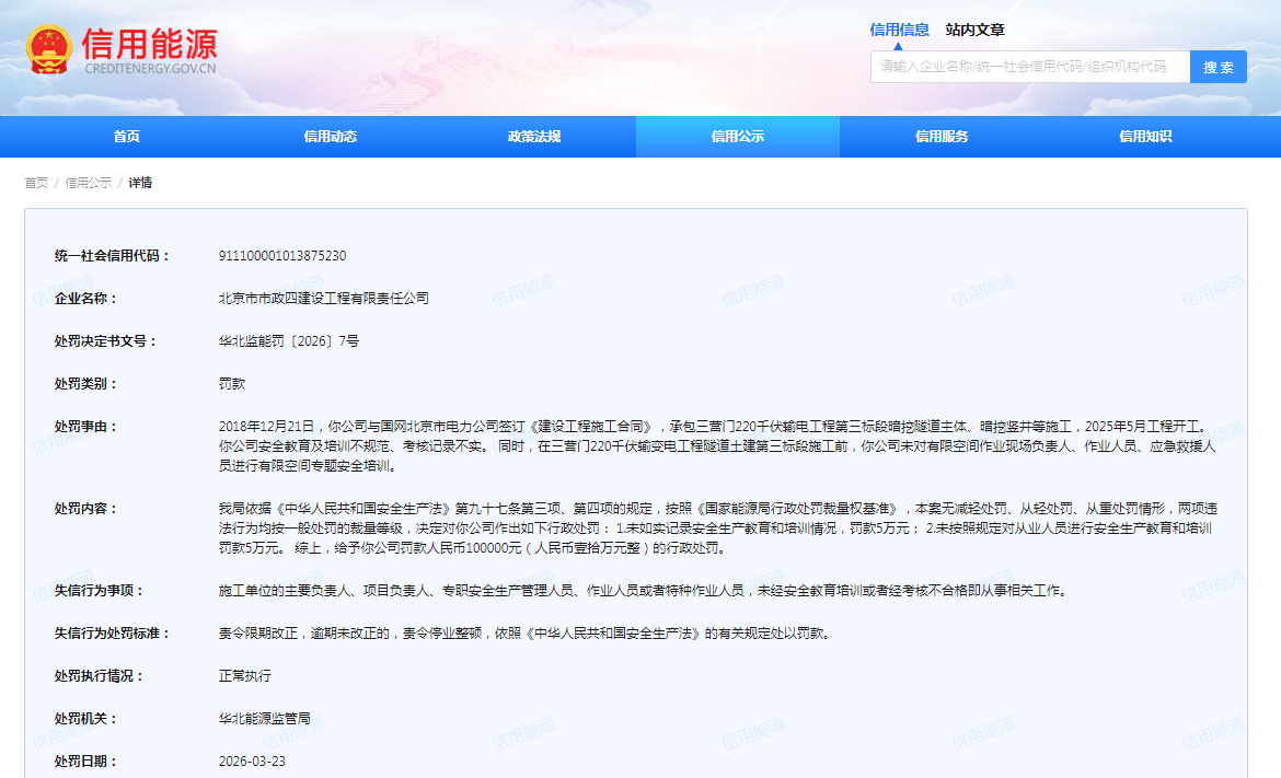 北京市政四公司所收的华北监能罚〔2026〕7号内容显示,2018年12月21日,该公司与国网北京市电力公司签订《建设工程施工合同》,承包三营门220千伏输电工程第三标段暗挖隧道主体、暗挖竖井等施工,2025年5月工程开工。该公司安全教育及培训不规范、考核记录不实。 同时,在三营门220千伏输变电工程隧道土建第三标段施工前,该公司未对有限空间作业现场负责人、作业人员、应急救援人员进行有限空间专题安全培训。