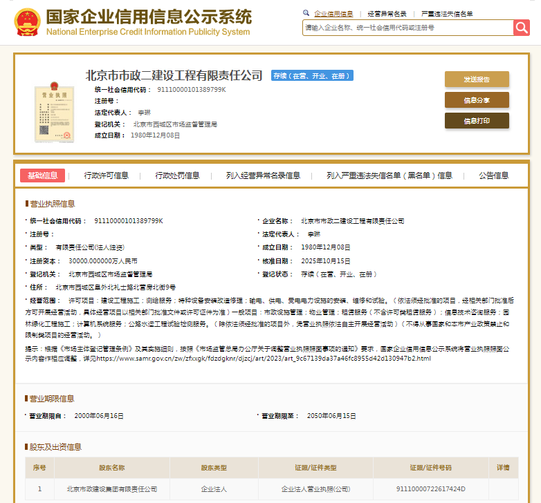 国家企业信用信息公示系统显示,北京市市政二建设工程有限责任公司成立于1980年,注册资本30000万元人民币,法定代表人李琳,由北京市政建设集团有限责任公司全资持股。